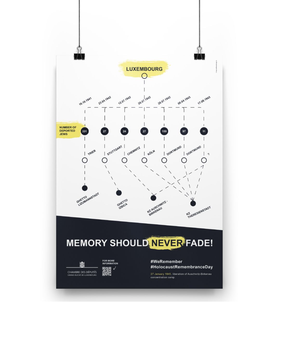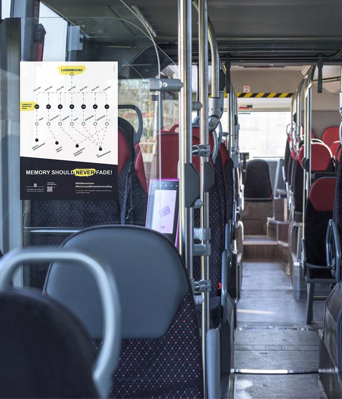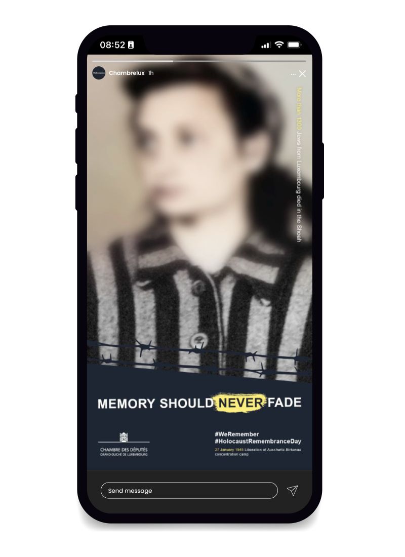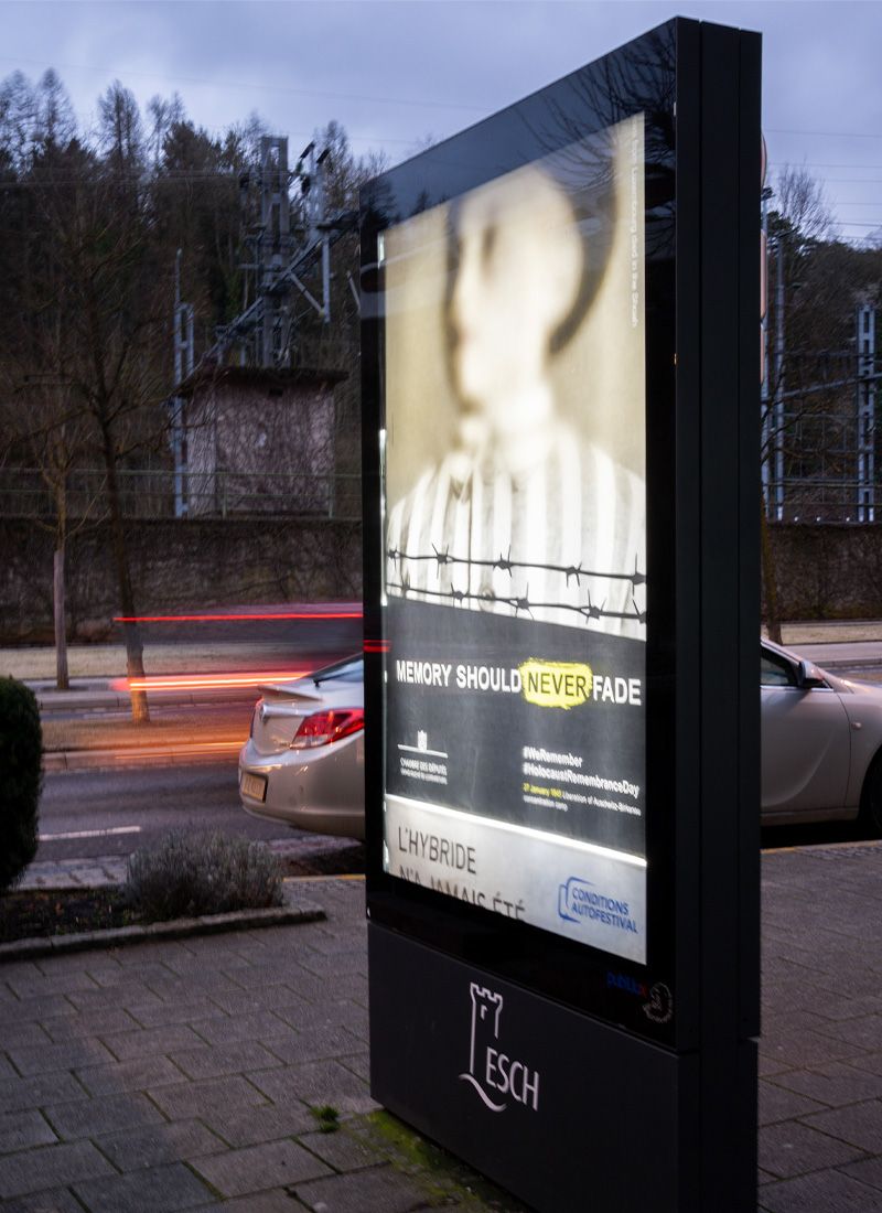 During the Covid-19 pandemic, the Chamber of Deputies felt it was particularly important to participate in the #WeRemember campaign in order to communicate a clear message to the public through a broad-based awareness campaign. Under the slogan ‘Memory should never fade’, posters and floor stickers were placed in Luxembourg railway stations to confront the population with the issue in the very places from which Jews were transported to concentration camps at the time.