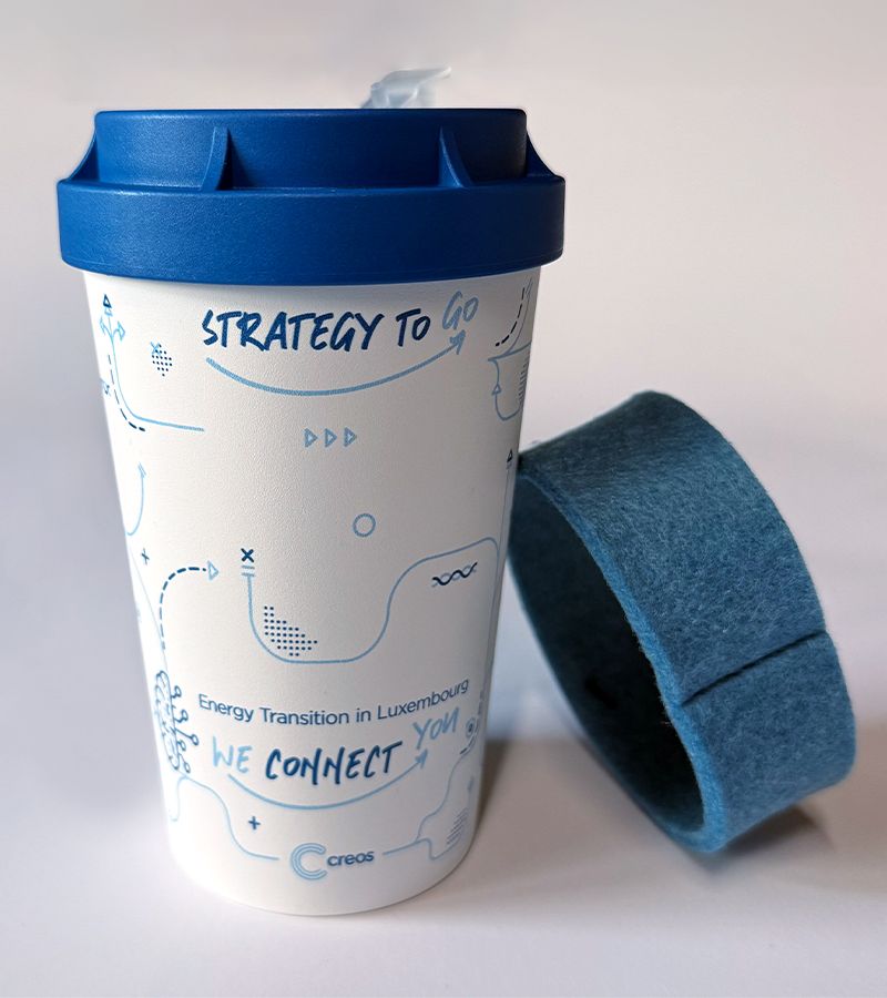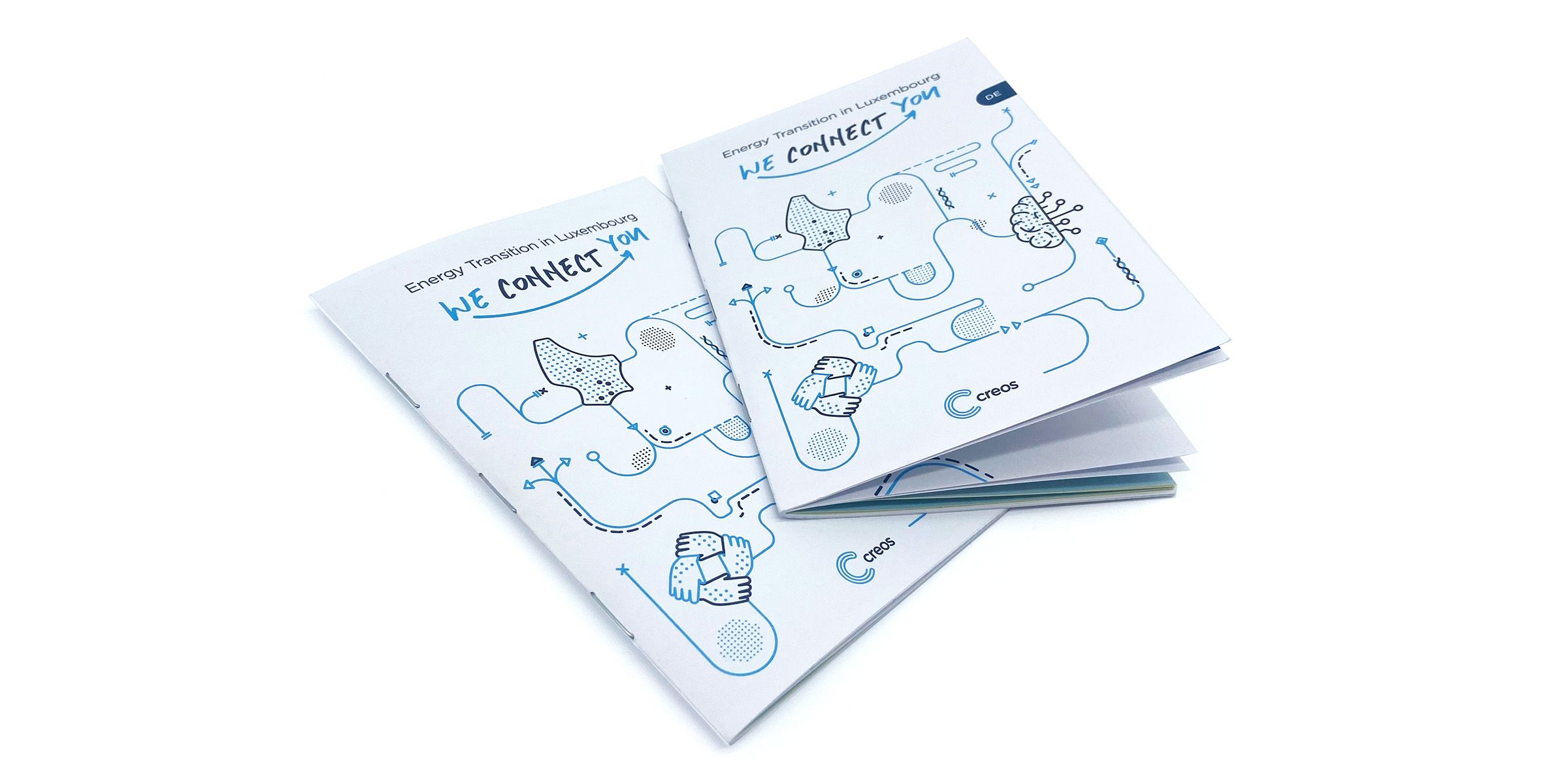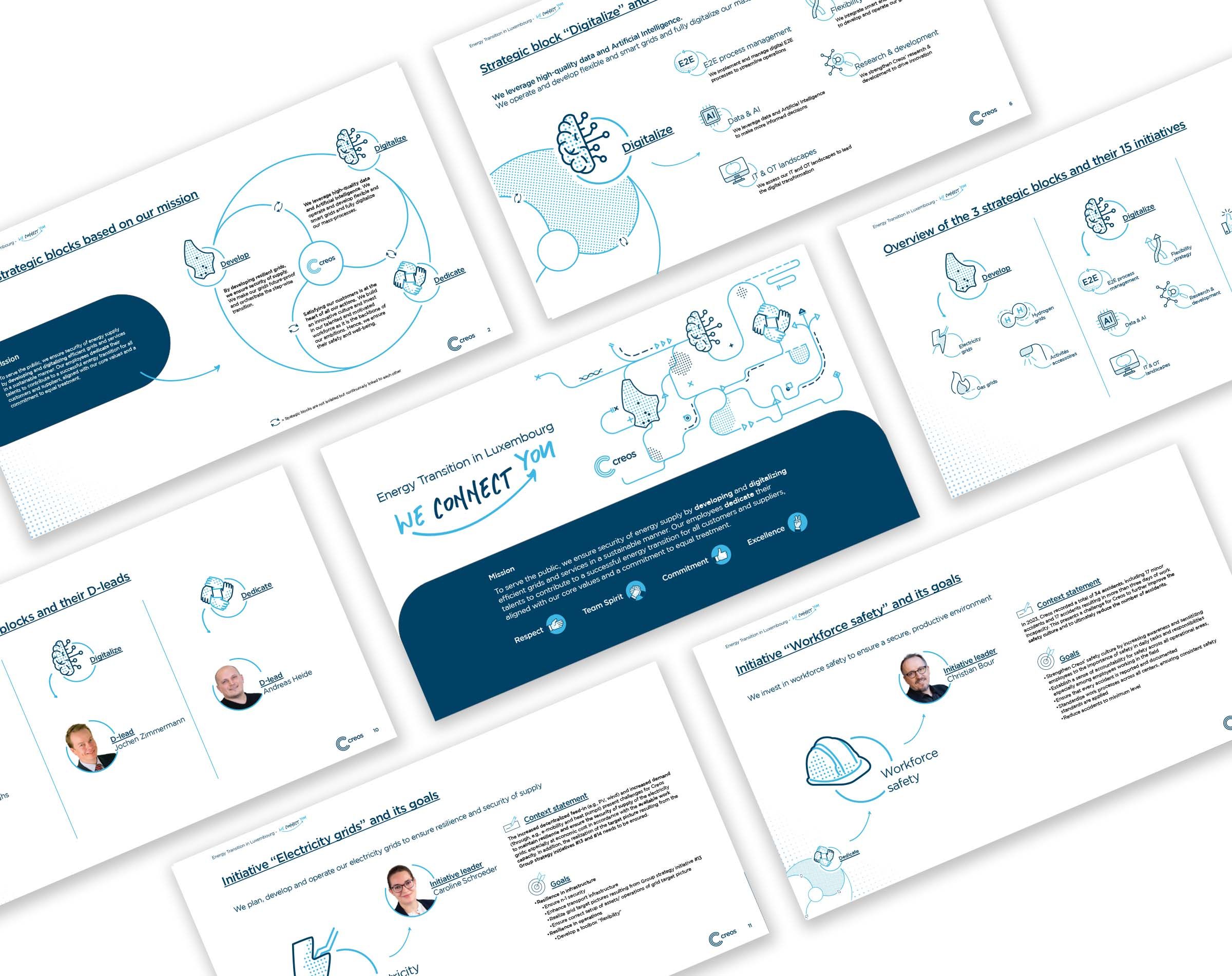 Find a consistent visual presentation style to illustrate the strategy Creos intends to pursue until 2030 and explain it using a small-format booklet and a PowerPoint presentation accompanied by short animations.