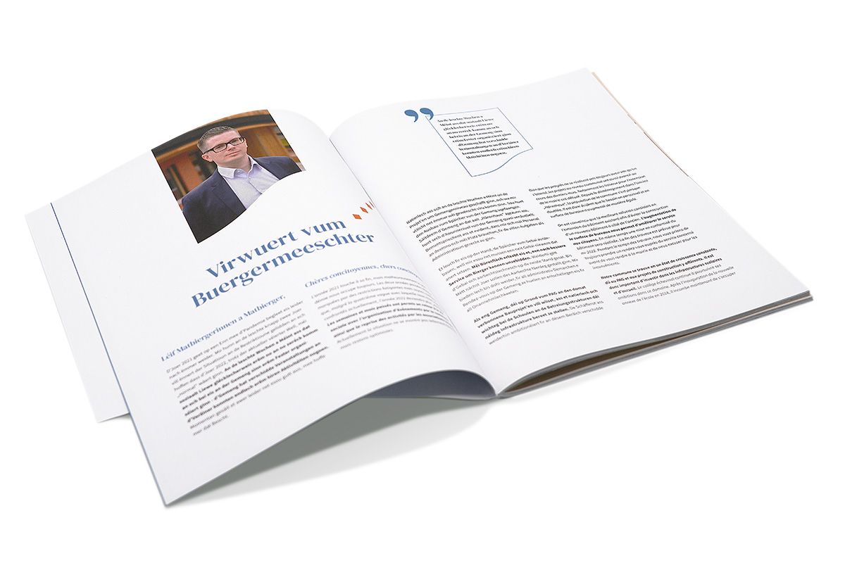 In 2018, the municipality of Manternach had a new logo developed with a corresponding visual identity. In 2021, the municipal report was revised, and it was decided to turn it into a magazine aimed at the entire population and all age groups. In addition to reports on municipal council meetings, it features articles on history, life in the municipality, current events, puzzles, recipes, and more.