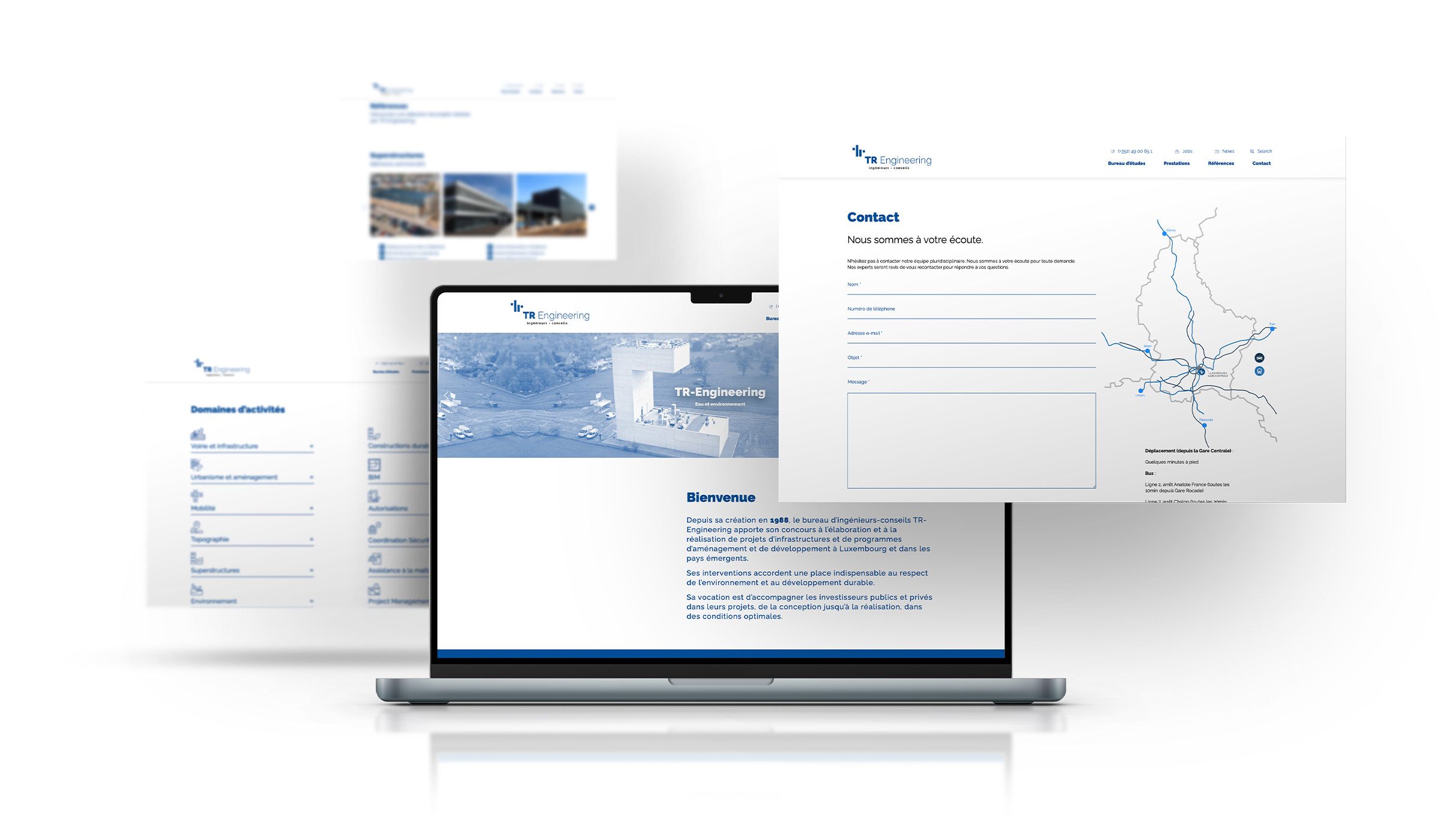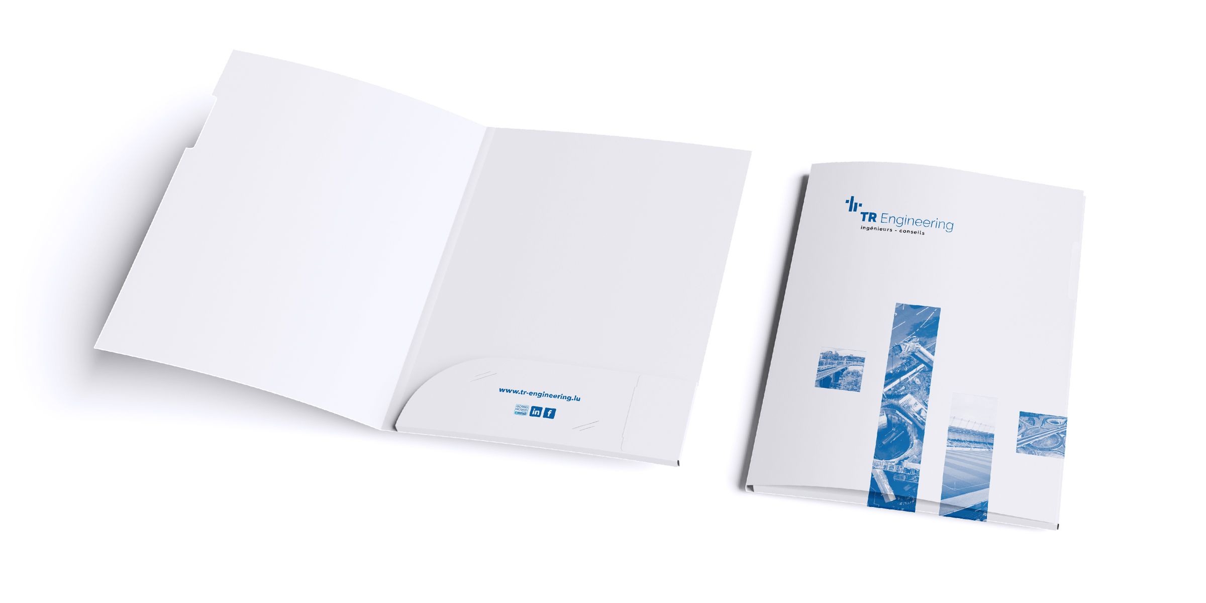 The engineering firm TR Engineering, together with its subsidiaries TR Géomètres and LuxAuTec, bases its internal and external communication on a clear, minimalist graphic language. The three logos bear the same signature and demonstrate the unity of the group of companies. The entire appearance is based on the two-tone colour scheme of black and dark blue. This colour scheme, in combination with large white areas, creates a distinctive, clean look that reflects the structured nature of engineering.