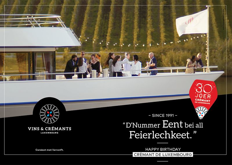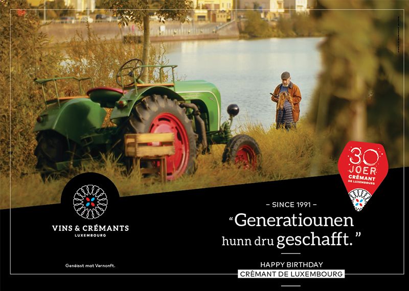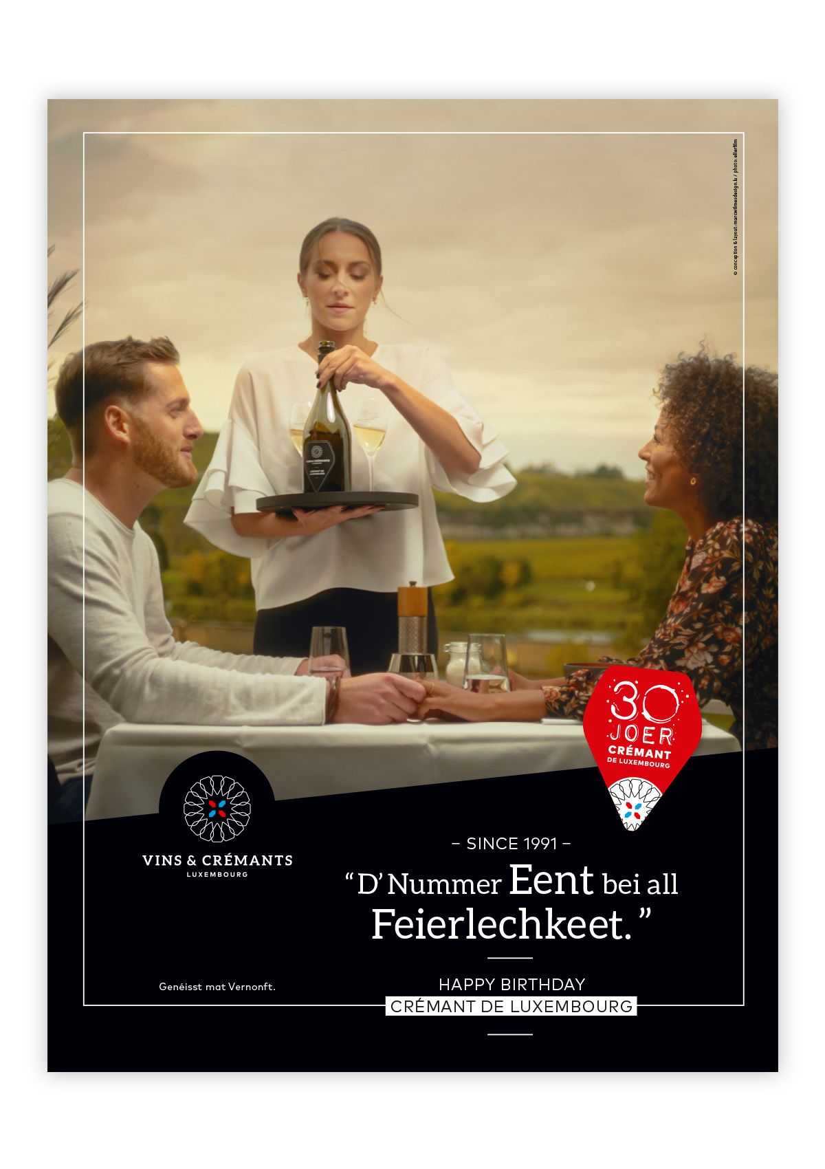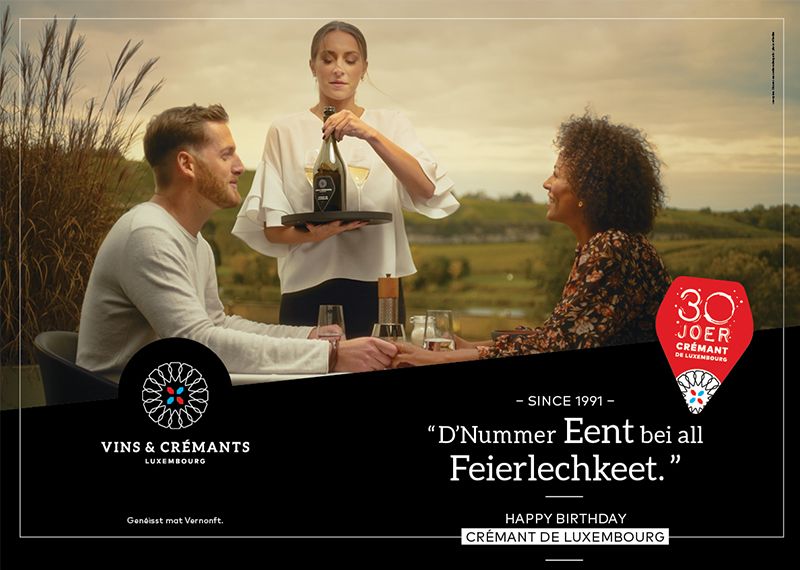 A large-scale advertising campaign for the 30th anniversary of Crémant de Luxembourg. The campaign consisted of various elements designed to reach different target groups. These included searching for the ‘children of Crémant’ – people born on the same day that Crémant appeared on the market – interviews with the founders of Crémant, and the production of a 30-second television commercial.